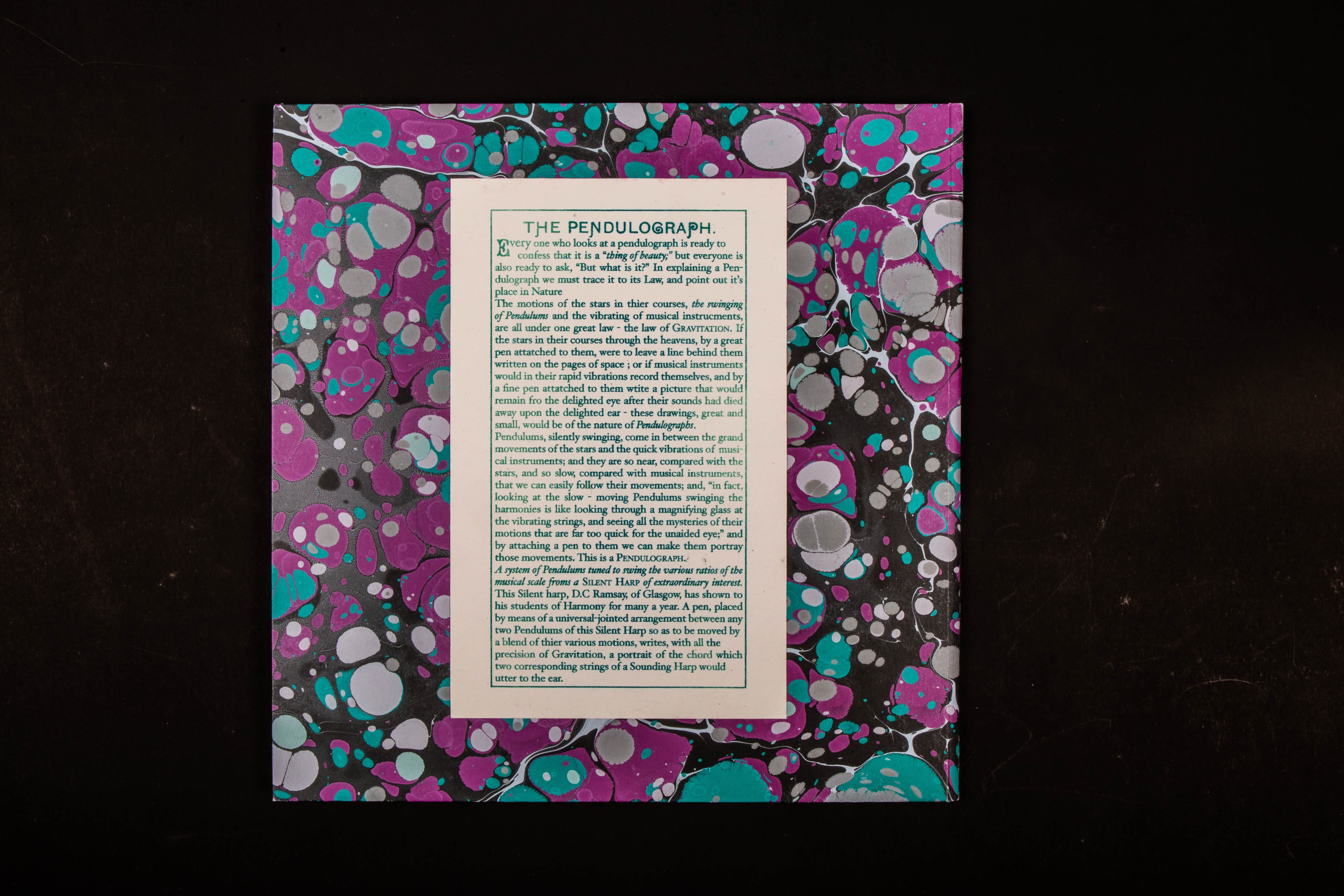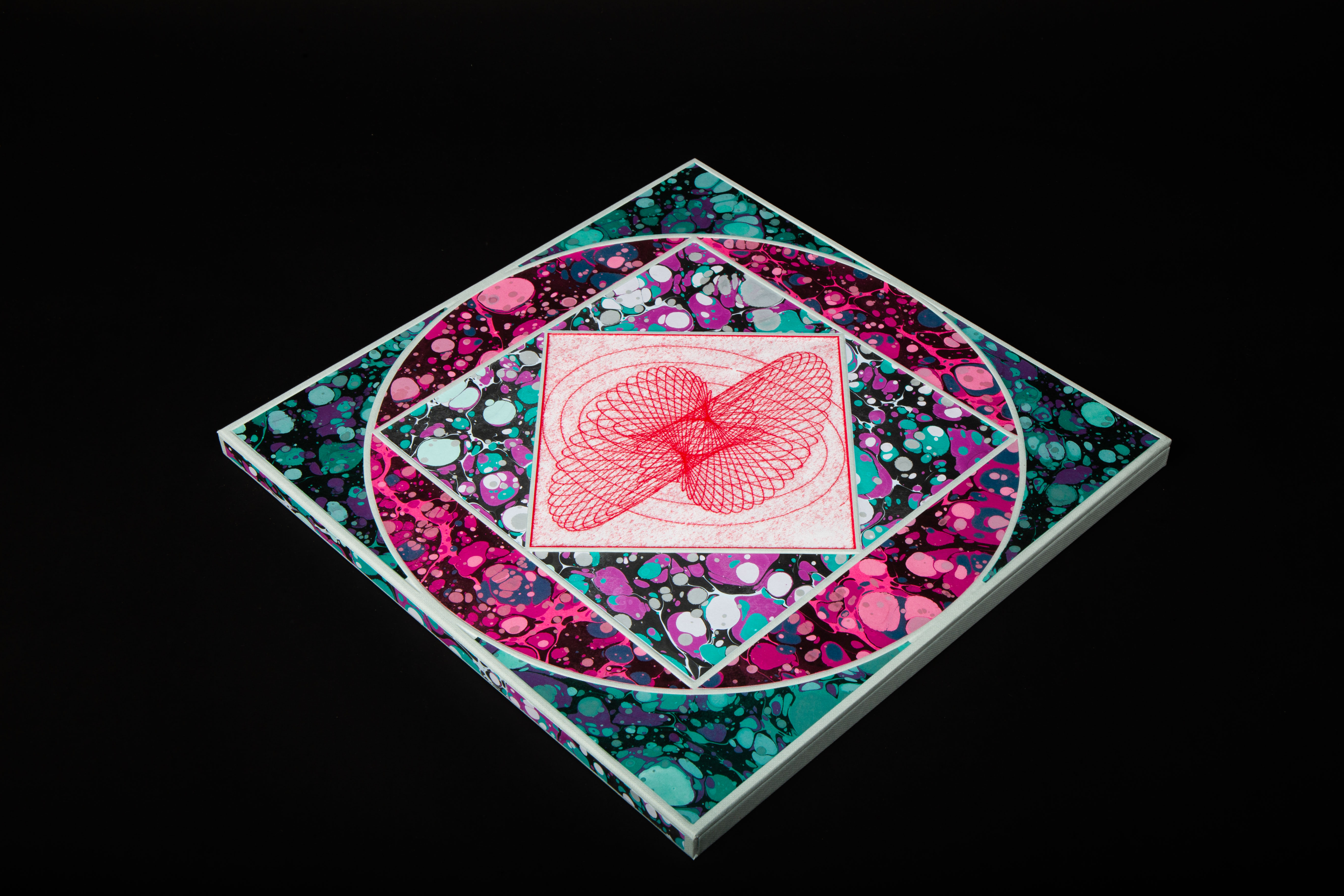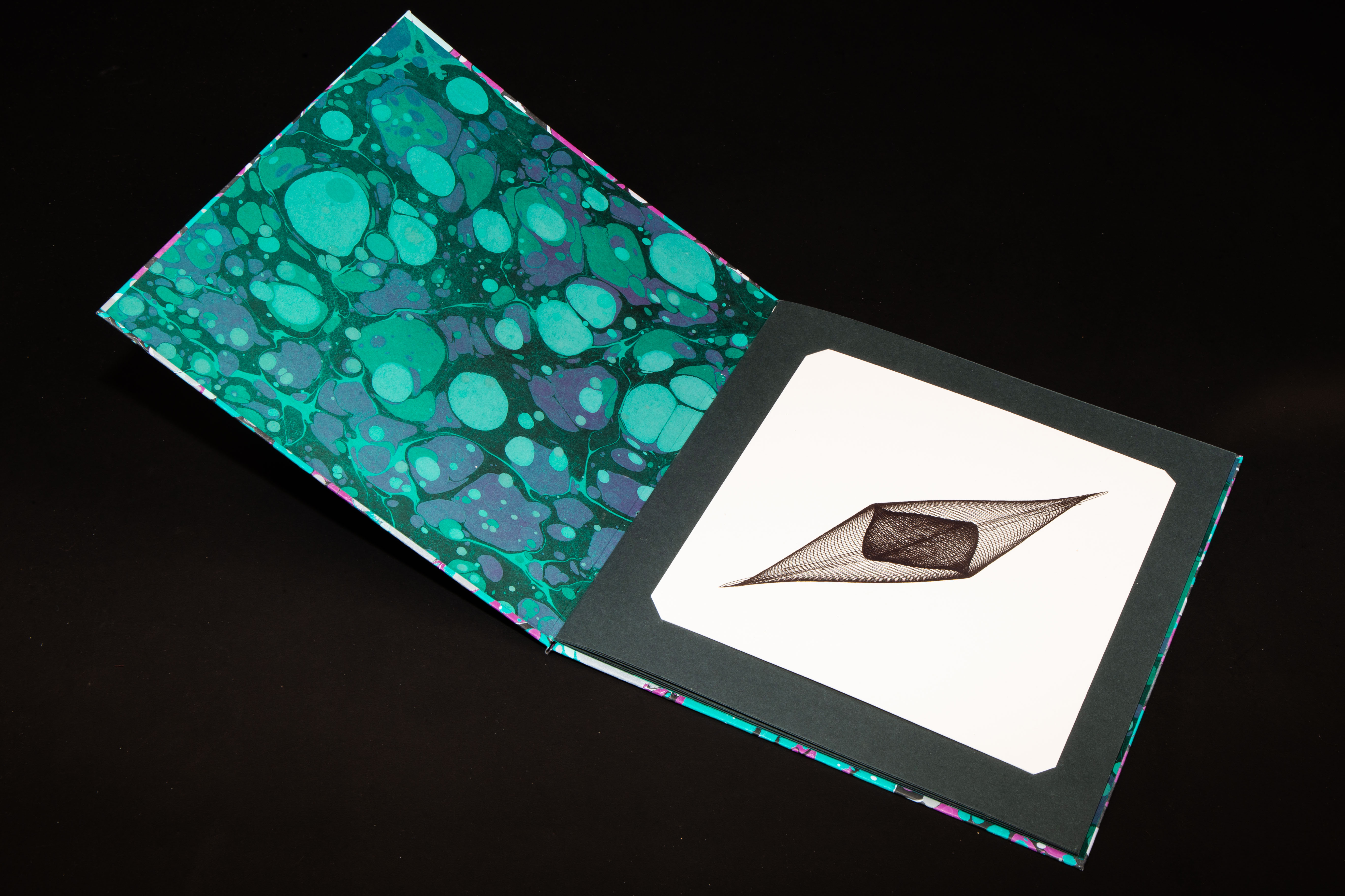 The box is made with hand marbled papers, and finished with a monoprint of an original pendulograph.