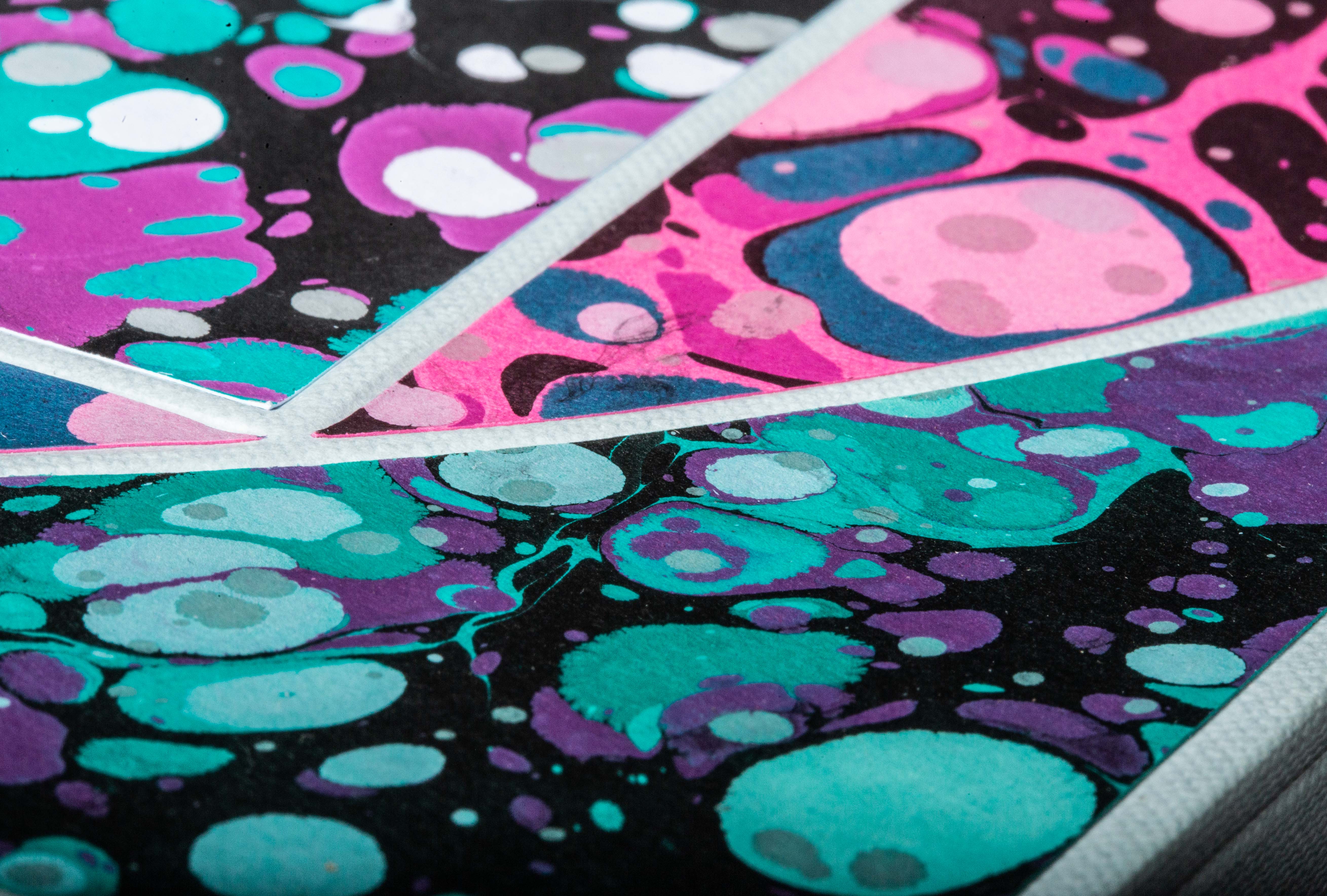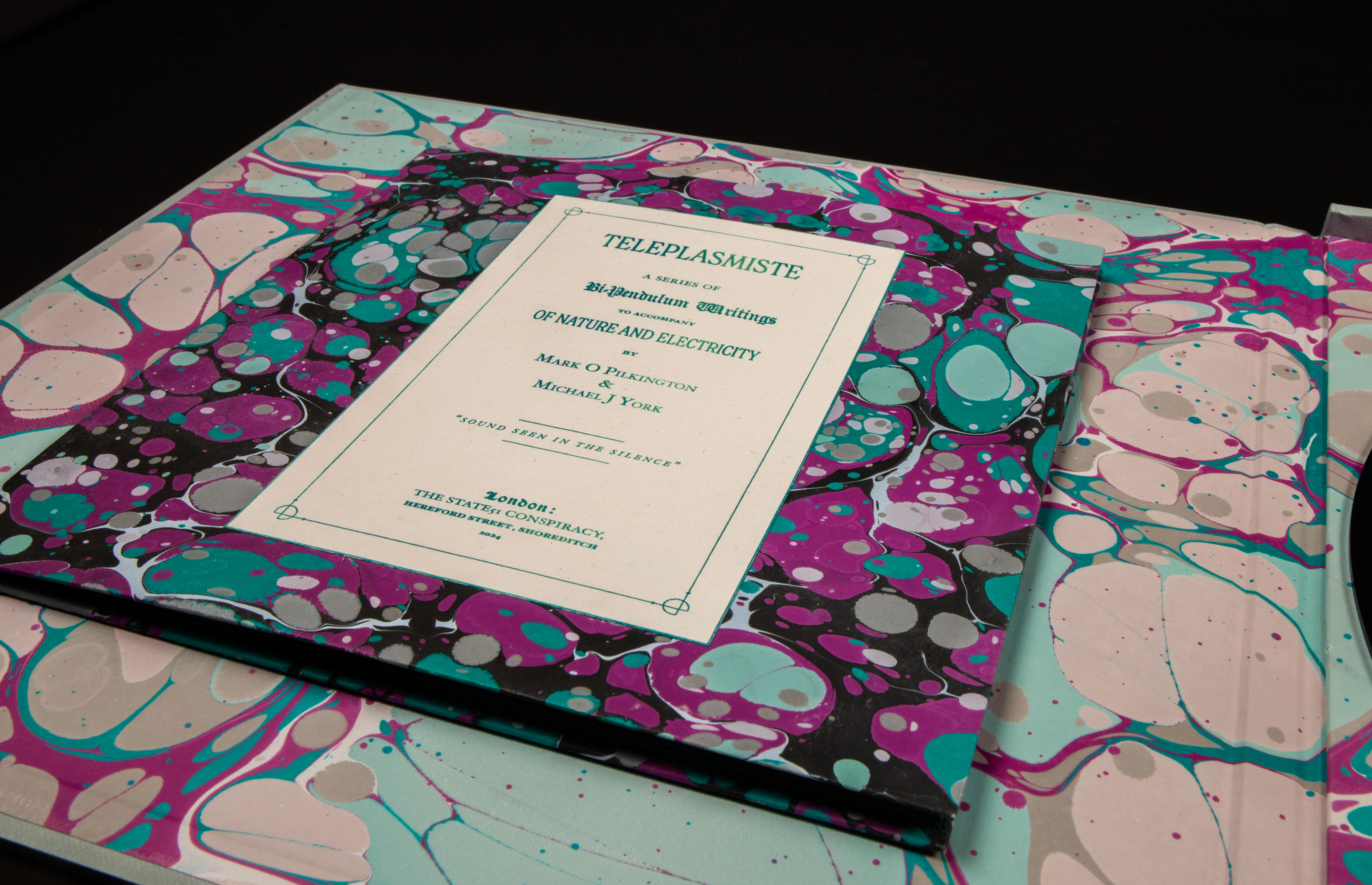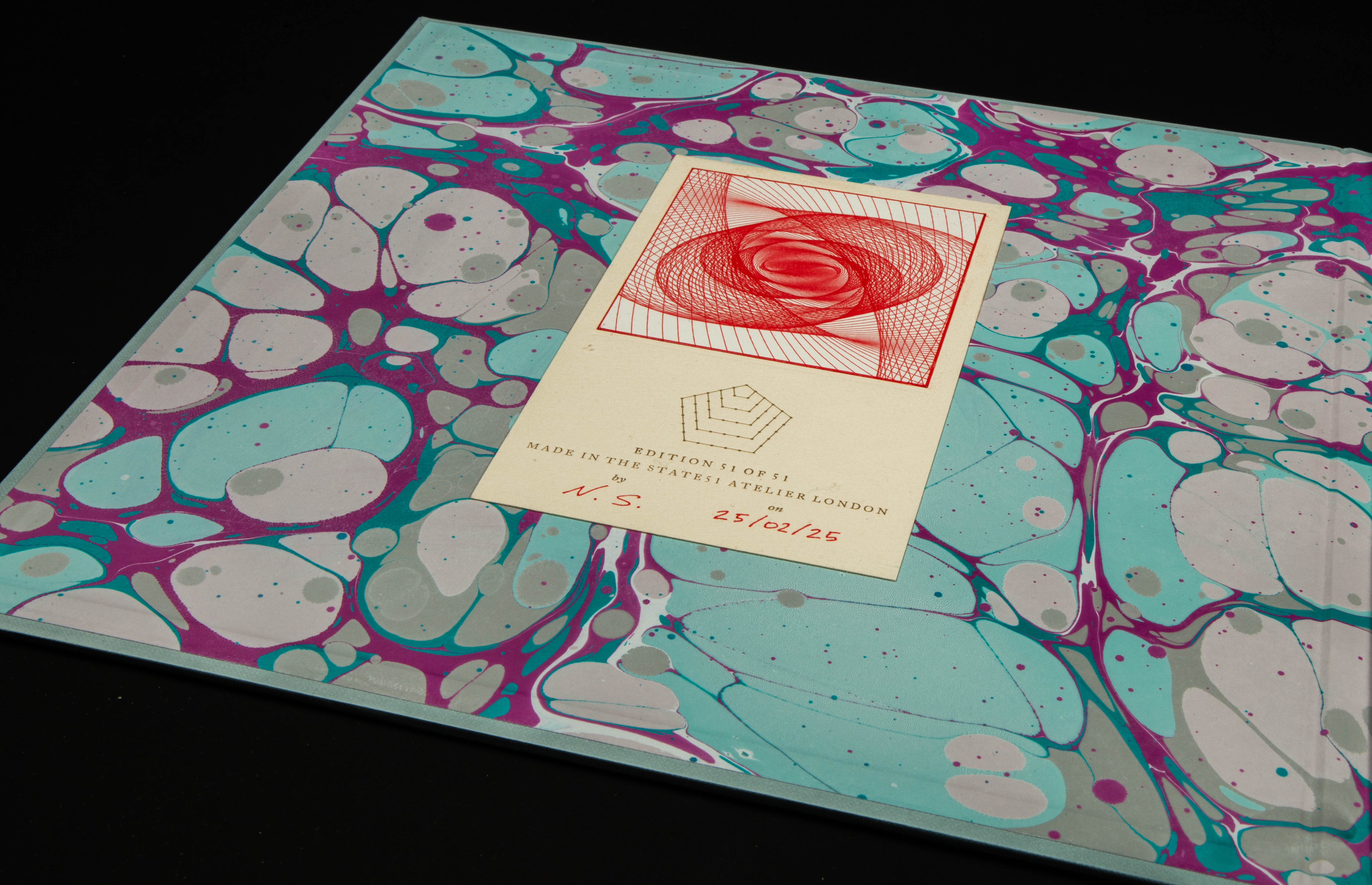 The box is made with hand marbled papers, and finished with a monoprint of an original pendulograph.