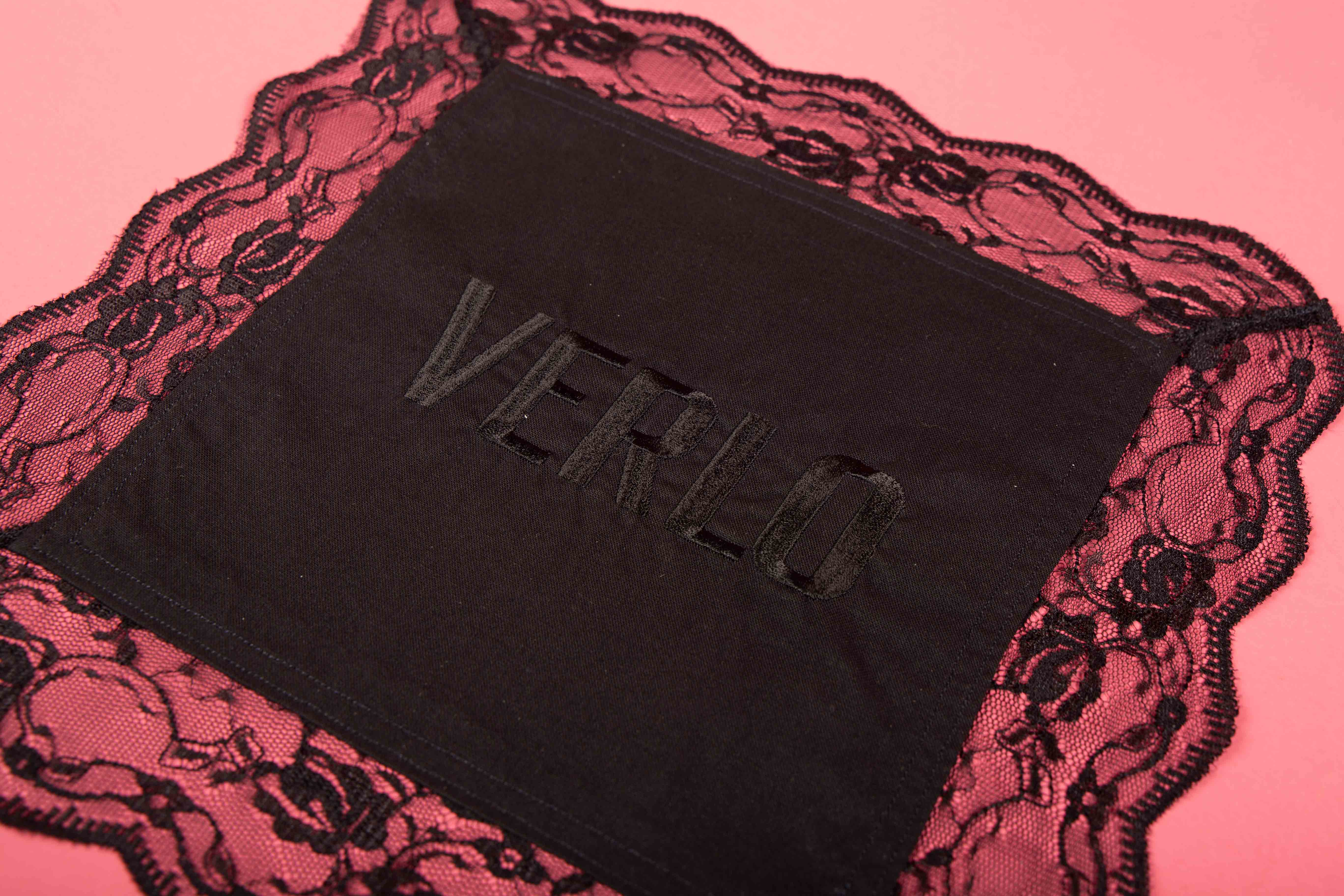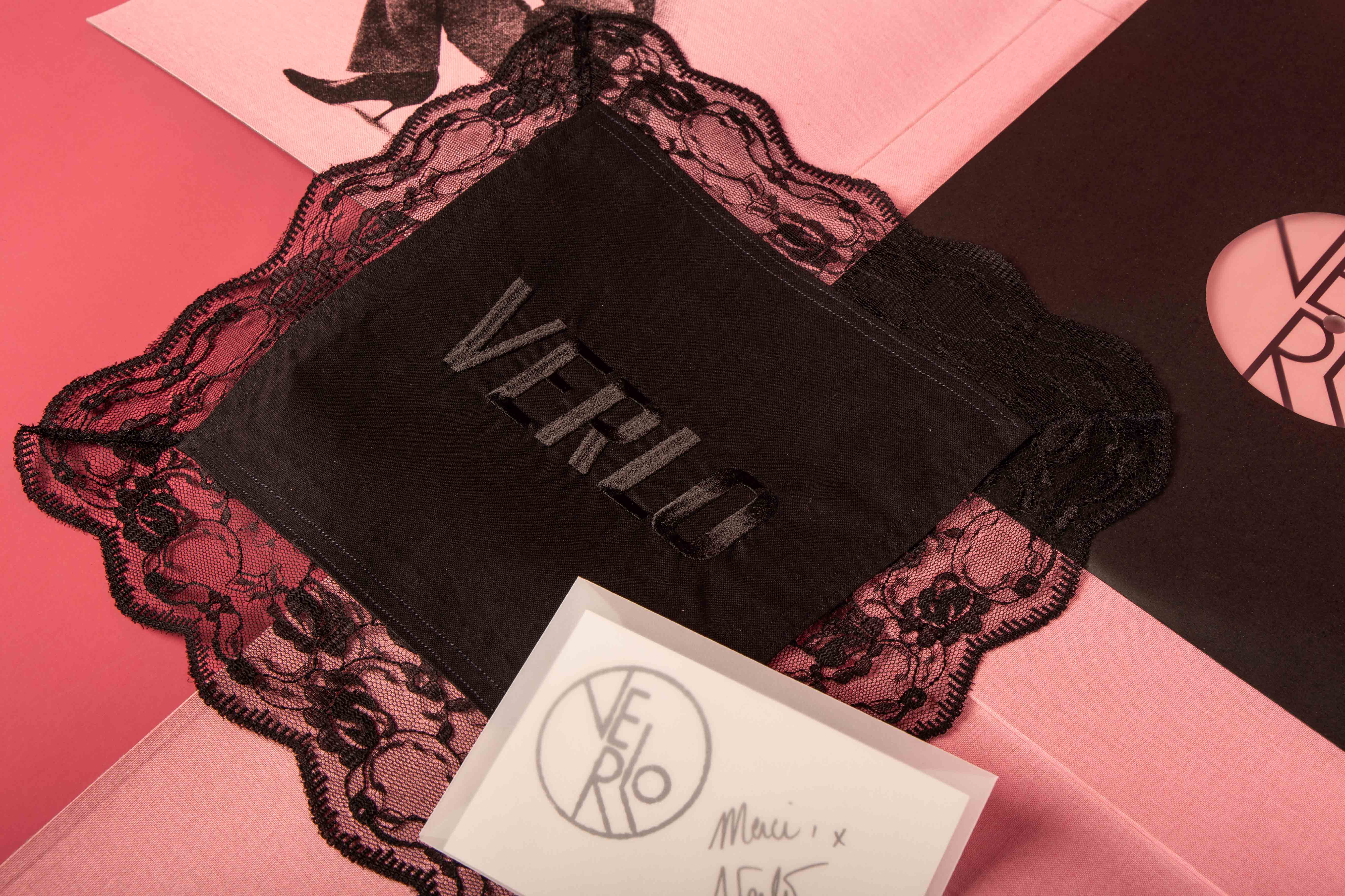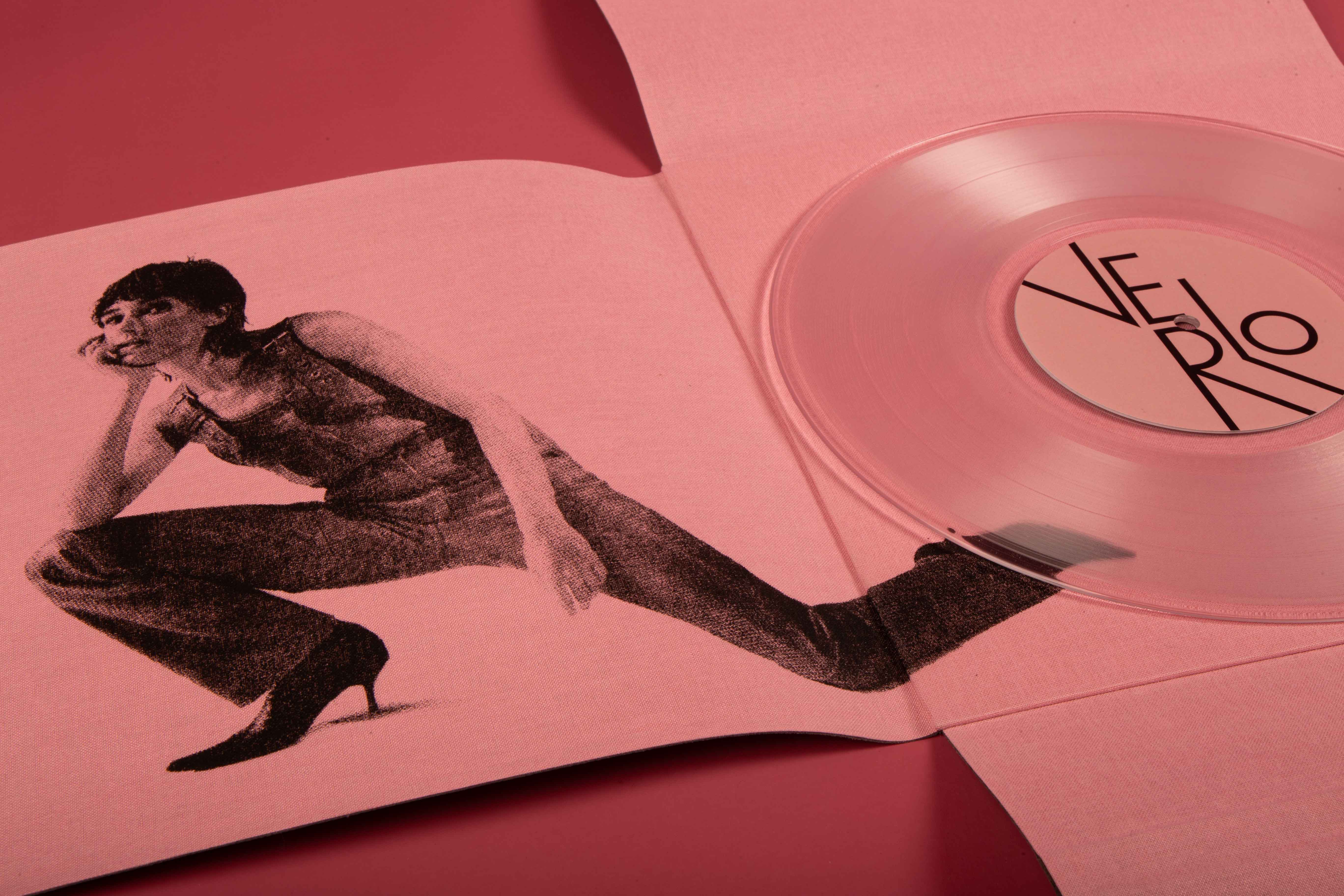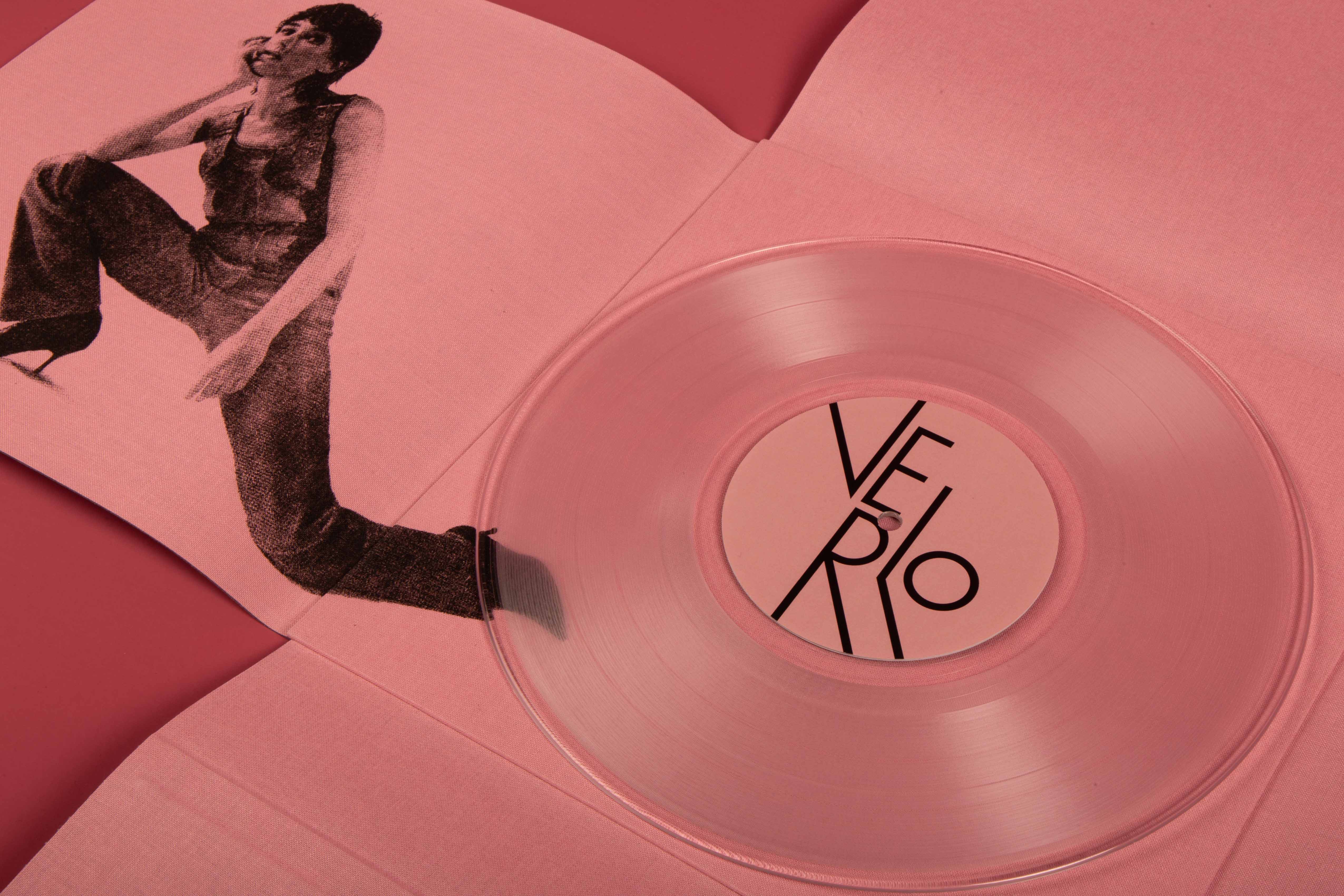 We wanted the folio editions to unzip like a leather biker jacket, to reveal a feminine pink cloth interior. The left and right panels of the cruciform folio are adorned with screen printed credits, as well as an image of Verlo. In the centre, the lathe-cut record,embroidered mouchoir and screen-printed lyric sheet are wrapped in a featherweight Japanese tissue, branded with the Verlo logo and hand sealed with a Verlo seal in red wax. A 7ml custom fragrance blended and produced by Priddy Essentials in the UK is included in every folio. Also included is a calling card housed in a translucent envelope, stamped and signed by Verlo herself, making each folio unique.